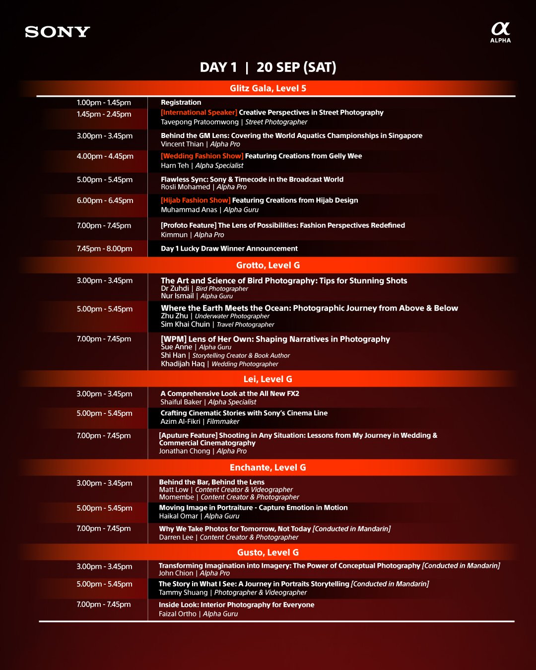 Our Sony Alpha Professionals—including photographers, videographers, and content creators—will be on-site to share their personal journeys, creative techniques, and professional workflows.