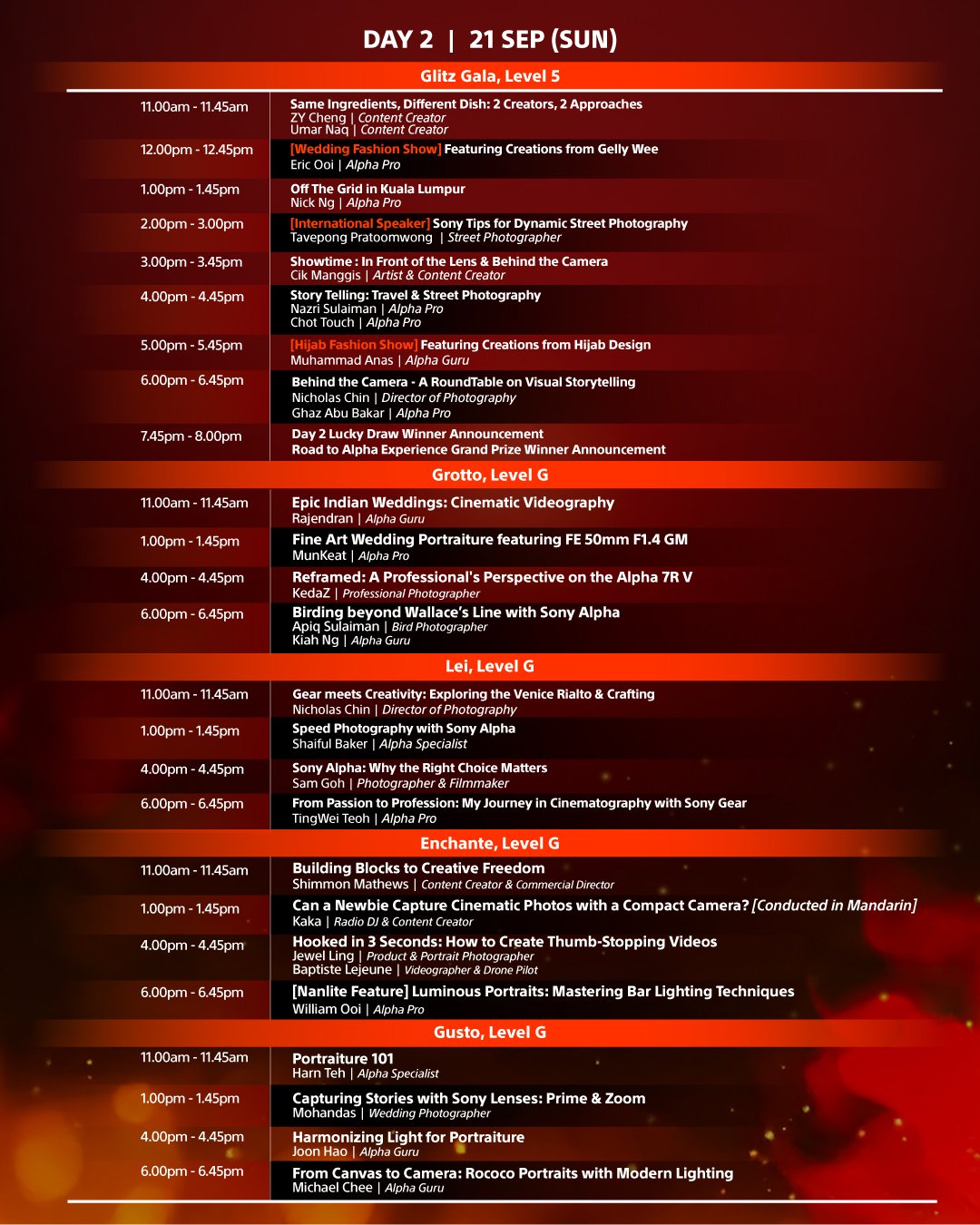 Here’s your guide to two full days of exciting sessions at Alpha Experience 2025. Explore diverse topics ranging from birding and wedding cinematography to street photography and portrait lighting. Whether you’re a beginner or a pro, there’s something for everyone to ignite your creativity.